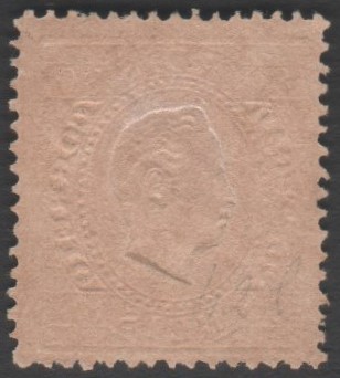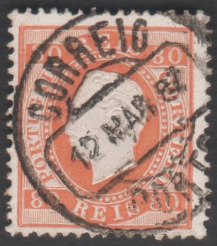1870-1876 – Selo Nº 42 – 80 reis laranja vermelho. D. Luís I.Fita direita, P. porcelana Dent. 12 3/4